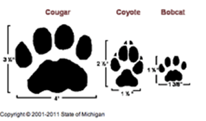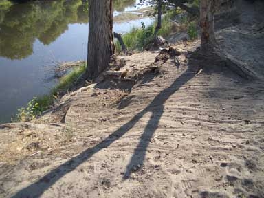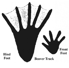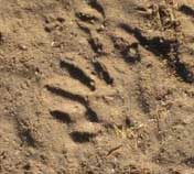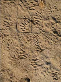 Animal tracks up the sand bank from the river. In the outline is a print which resembles the front foot track in the drawing on the right. (Photo by Marion Vargas)
