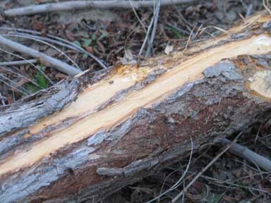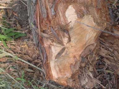 Beavers eat only the inner bark of trees such as this cottonwood. They carry branches from fallen trees off to their dams and eat the bark later. This tree fell over not long after this picture was taken. (Photo by Janis Freed)
