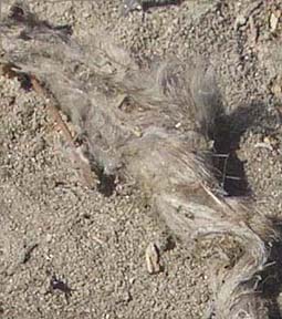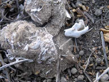(Left) Scat and bones. This clump of coyote scat, which is lying on top of what appears to be rabbit droppings, has various tiny bones embedded in it -- a rabbit dinner one evening? (Right) There is plenty of fur in this scat.