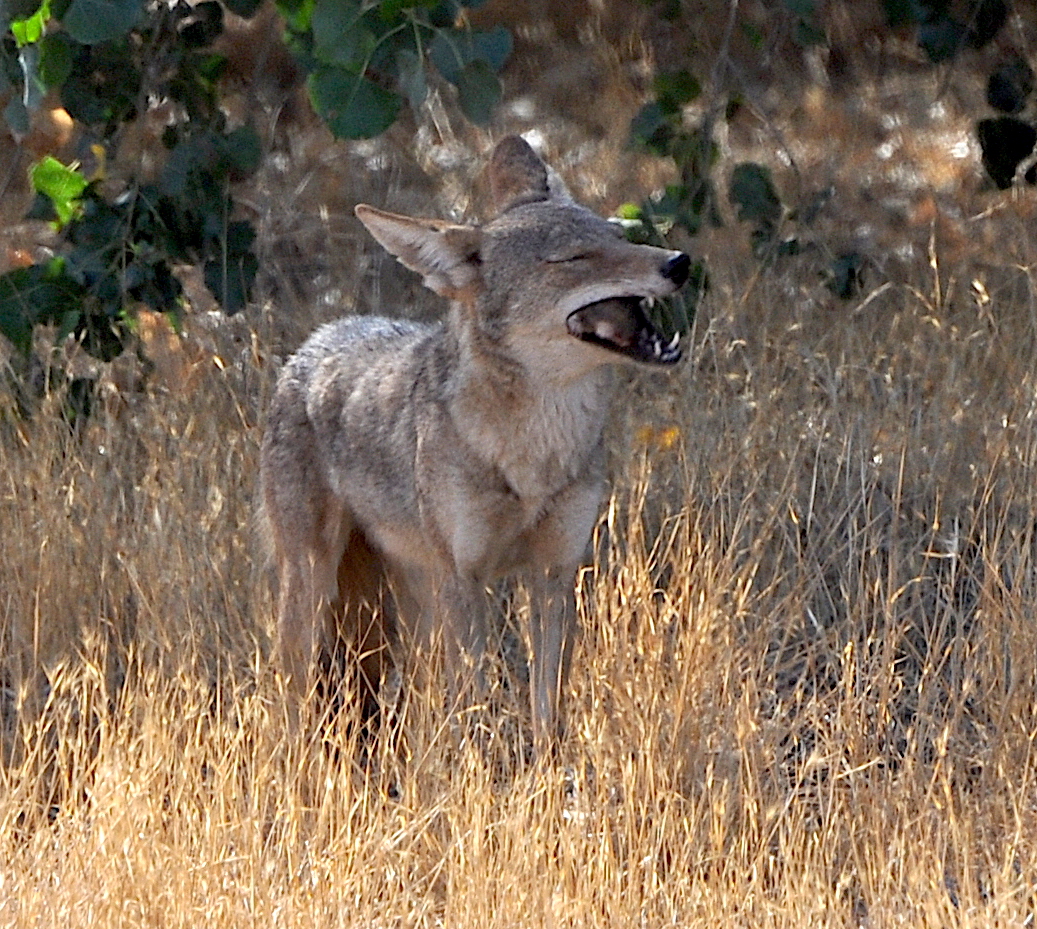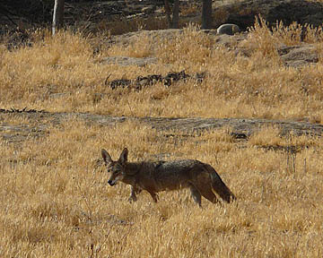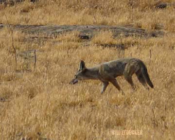 These two coyotes were spotted in a grassy field between the Kern River and the Carrier (Kern Island) Canal, early September 2008. A mother and two cubs were sighted several times in the same general area in the spring. Family members may travel together, as these two are. (Photos by Bill Lydecker)