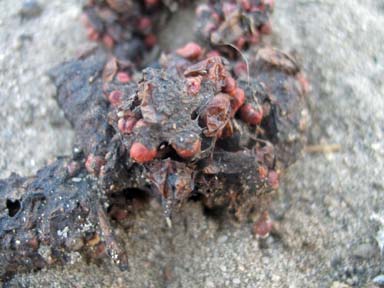 The "calling card" of, perhaps, a skunk or racoon. This scat is studded with small reddish seeds.