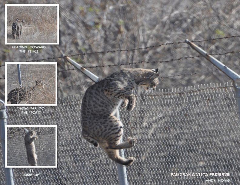 Later in 2011, Honig came across another bobcat strolling along. He followed it and eventually came to a fence; he expected it to go under, as before, but she surprised him.