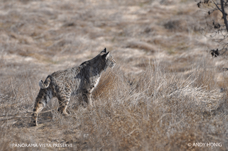 On a February day in 2011, Andy Honig was walking near the Beardsley Canal when he saw this bobcat. He quietly followed it, taking pictures for some distance through the salt bush. The cat was not particularly disturbed by the photographer but perhaps it was distracted just enough that she did not notice the jackrabbit as she passed by. At times she stopped and looked back. Her distinctively wide face and longer hind legs were easy to observe. In a short distance, the bobcat came to a hole in the fence and went through to the other side.