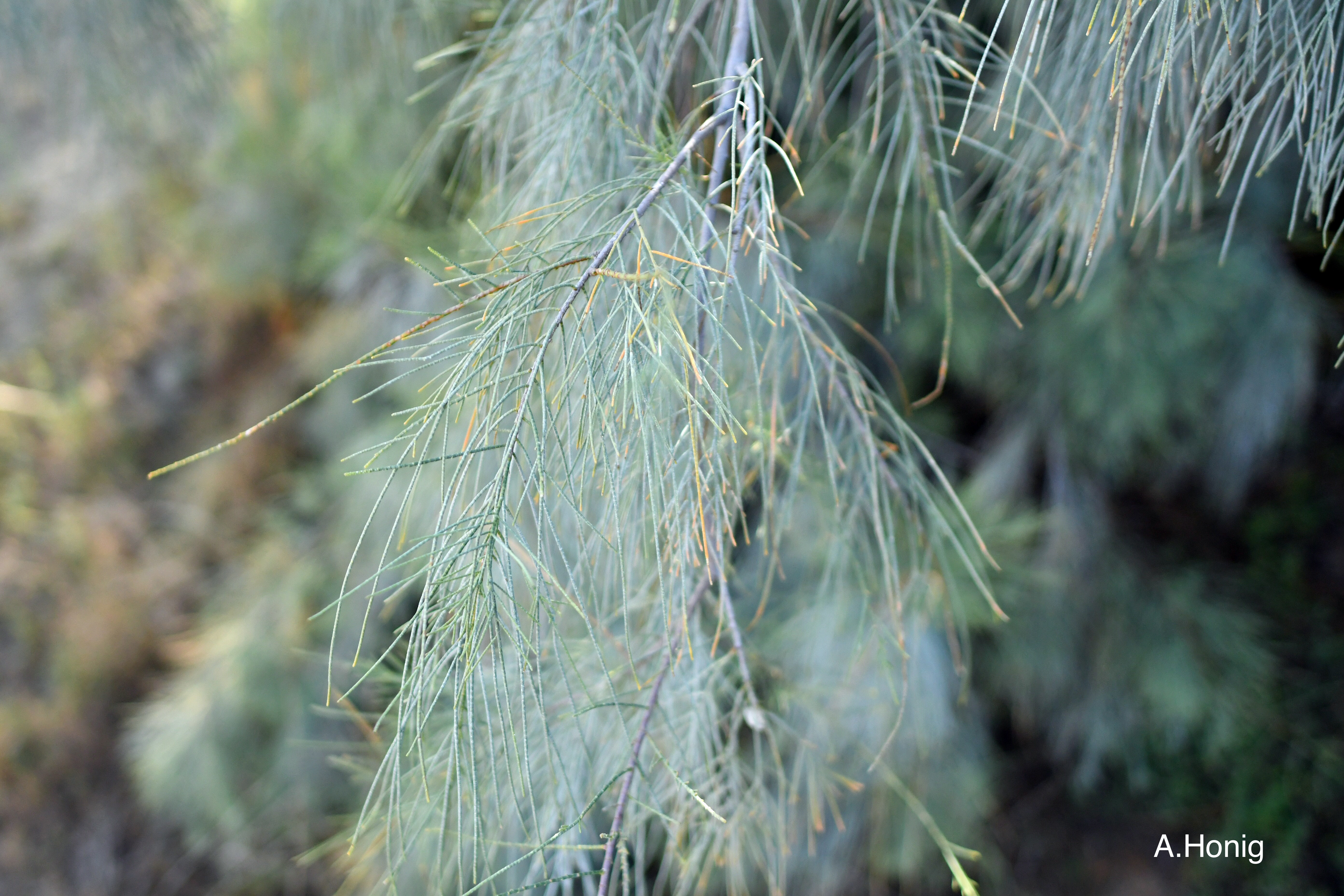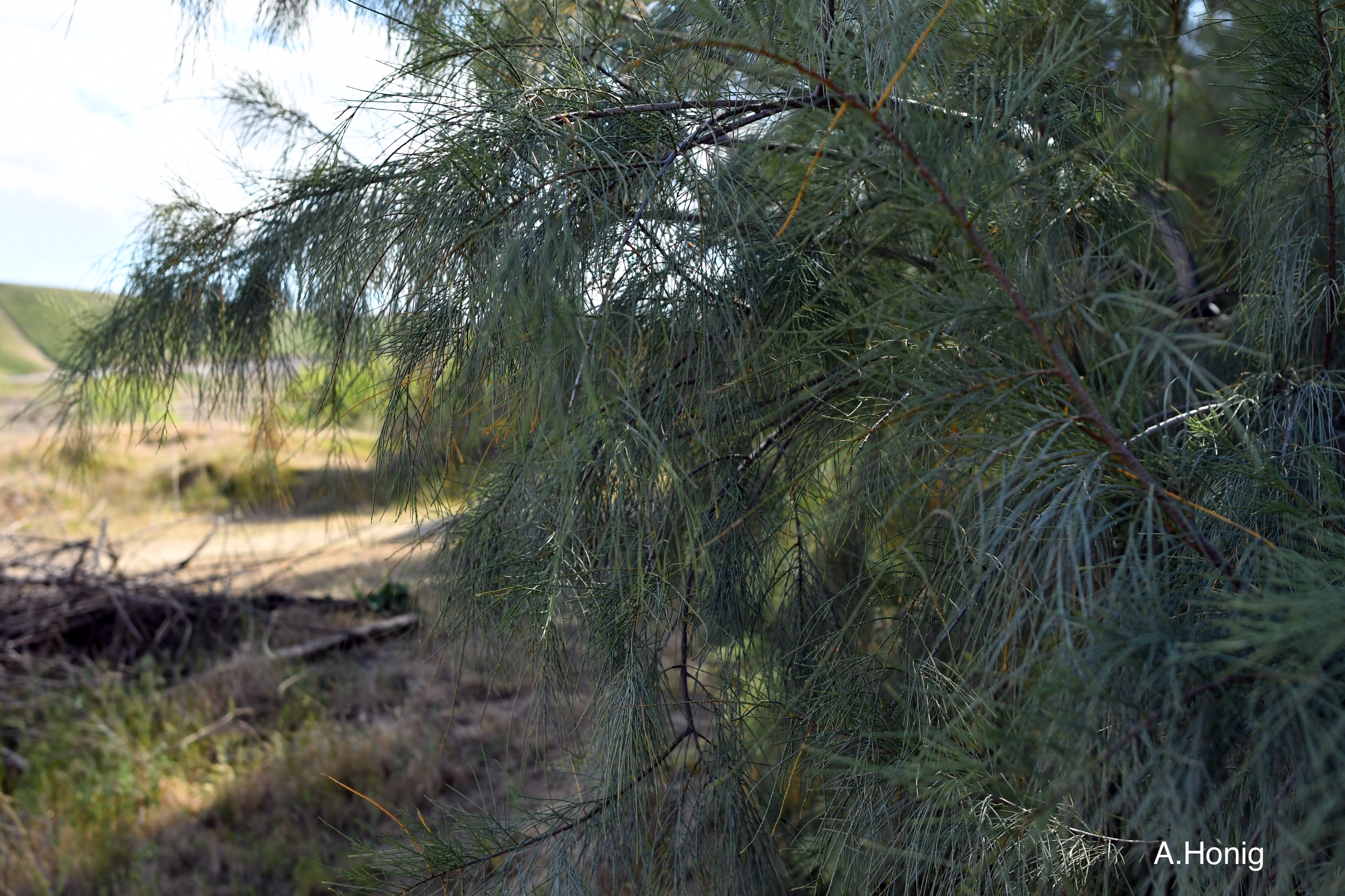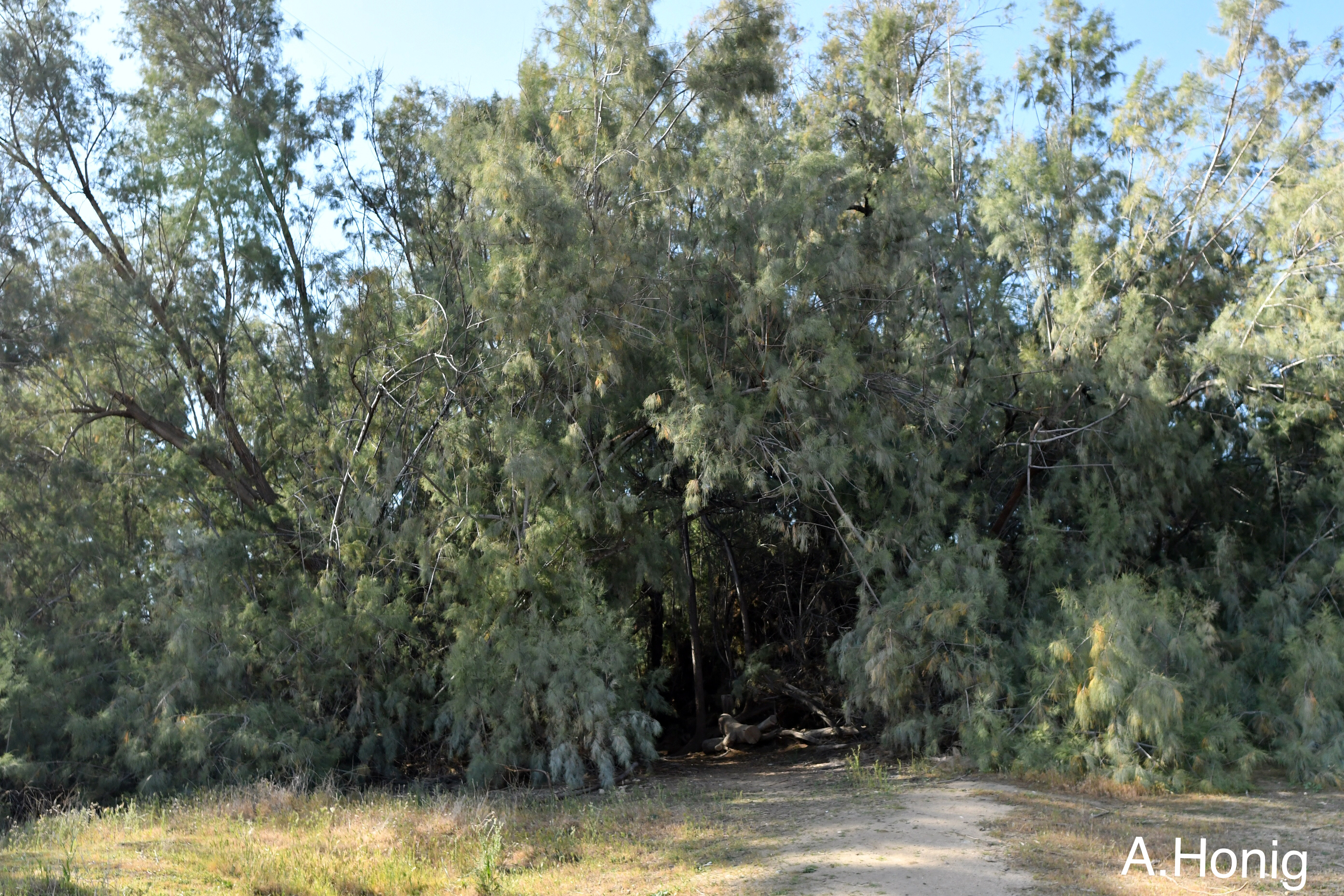 Evergreen, native to North Africa and the Middle East. Often planted in the southwest US as a windbreak. Grows up to 60 feet. Unlike deciduous tamarisk, it generally is not invasive. It is found in a large grove in the eastern end of Panorama Vista Preserve next to the horse trail. The trees probably were intentionally planted there decades ago, but have not spread. At some time in the future, they will be removed as a non-native with low wildlife value. Homeless encampments have frequently been found in this grove.