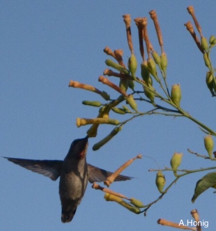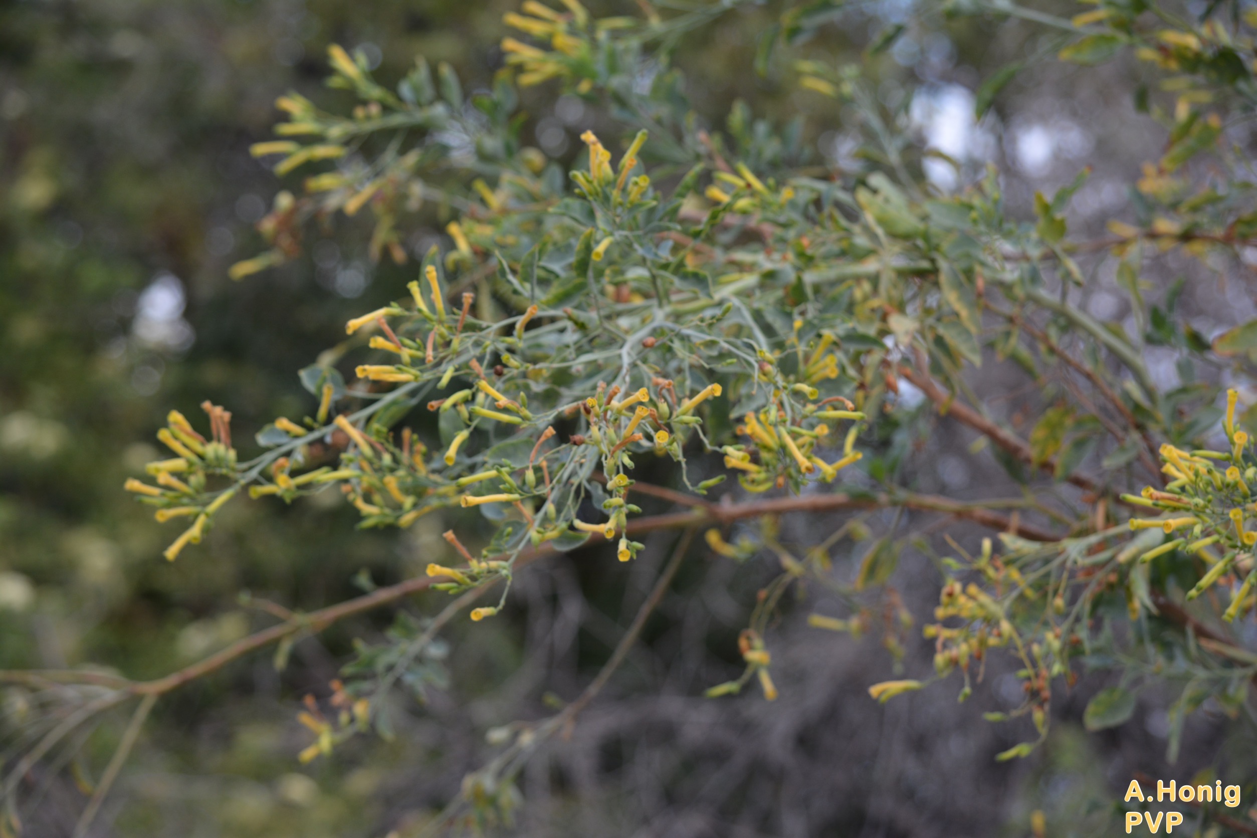 It is pollinated by hummingbirds, who are attracted by the showy yellow tubular flowers.