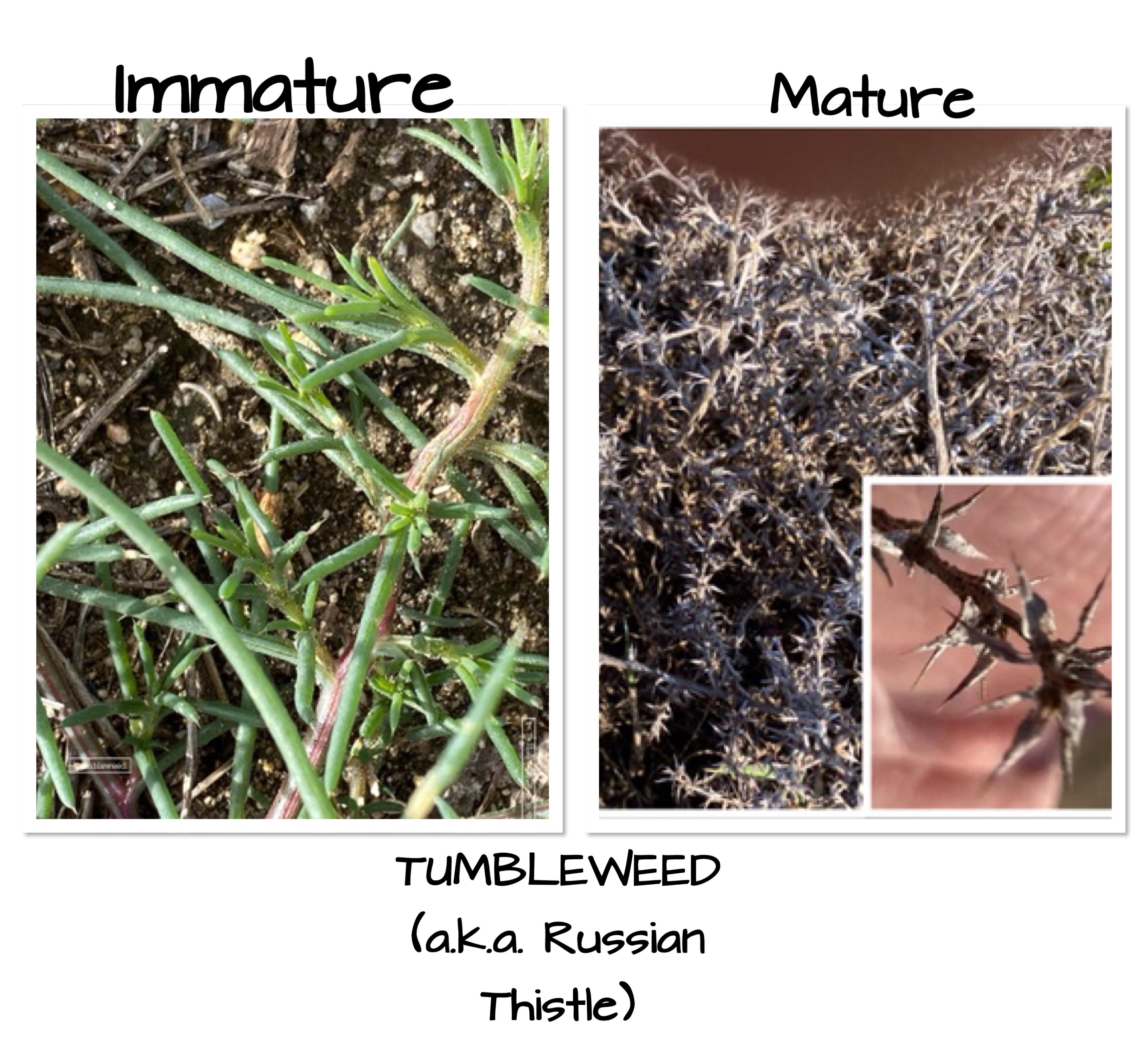 Eradication of tumbleweed is difficult. Digging up young ones is an option but a daunting one given how many sprout up every spring. Nevertheless, volunteers at our local nature preserve, Panorama Vista, give it a good whack-a-mole try. Periodically, PV personnel resort to controlled burning with permits from the San Joaquin Air Pollution District. Tumbleweeds burn ferociously hot and one can only imagine what would happen if a wildfire occurred.